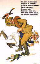 Unknown The other side of the coin: a Russian soldier whips the Kaiser while stepping on a miniature fleeing Franz Josef. |