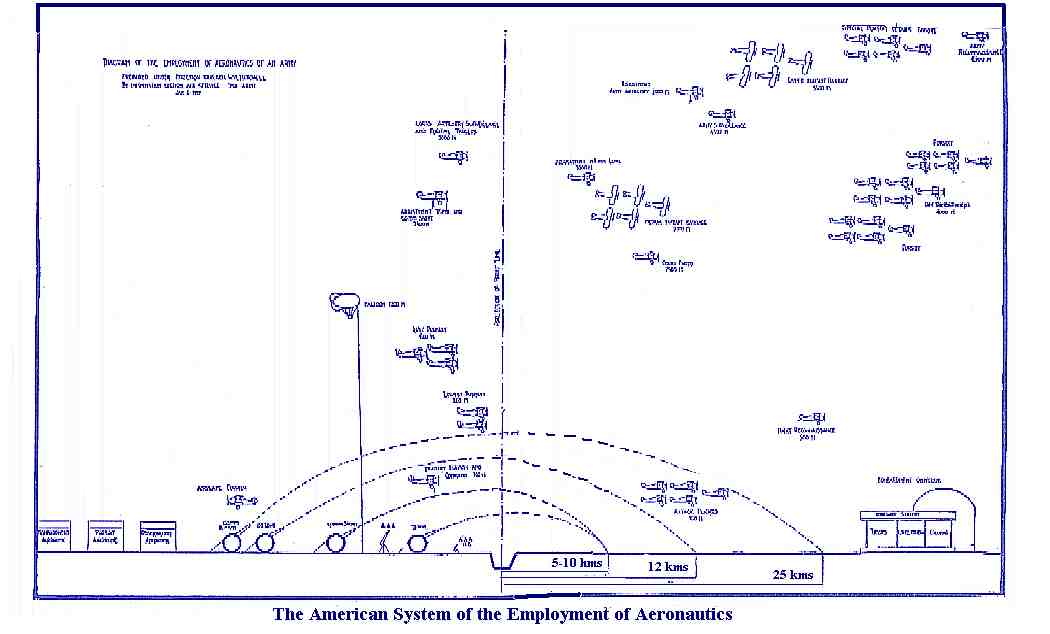This diagram represents a vertical section of the air as it would appear to one able to see every part of aviation on a good day during our operations of September, October, and November 1918. The notch in the horizontal line indicates the trench or dividing line between hostile territory, which is on the right of the vertical line projected up above it, and friendly territory, which is on the left. On the ground the opposing infantries face each other on the trench line. The anti-aircraft machine guns are shown close to the troops, and the anti-aircraft artillery immediately behind them. The heights at which the various aviation acts are indicated in meters. The special pursuit details, acting at a great altitude (practically as high as they can get) work directly against the enemy's reconnaissance machines. Our own Army reconnaissance, acting up to 20,000 feet, habitually went thirty or forty miles into the enemy's territory. The Army's surveillance machines kept cruising over the front to report from their own position, by wireless, whatever they could see, so that it could be immediately attacked by their aviation elements. The pursuit and day bombardment elements, shown to the right of the diagram together, indicate the independent or strategical aviation, which acts by itself directly against the enemy aviation and his ground troops.