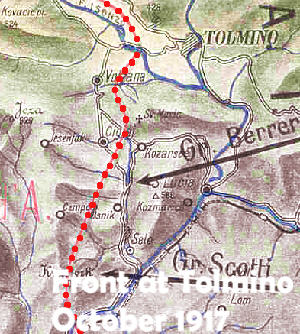 By the spring of 1917, the Italian Army had gained control of both sides of the Isonzo river from the Plezzo basin, where the river exits the Julian Alps and flows to the Adriatic Sea. But a small 7-kilometer long bridgehead running across a bend in the Isonzo River just south of the town of Tolmino remained in Austrian - Hungarian hands. From a dominating hill called Santa Maria on the west side of the river, the German planners could observe Italian preparations and at the right time, launch their offensive.