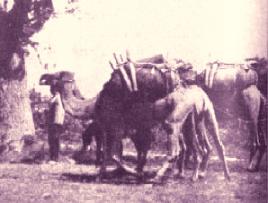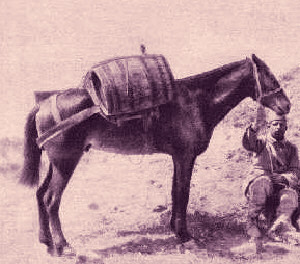Across the open desert a small column of mules is flinging a brisk trail of dust up to the brassy sky. They are in strings of three, and a native drabie is hanging on to the lead rope of each string. Each mule has a squat tin tank hooked on either side of his pack Caddie. Two of these pakhals, as these rope-netted tanks are called, will fill the water-bottles of a platoon. At intervals along the column a British soldier strides along, bare-armed and bare-kneed, his shirt open over his brown chest, one sun-blackened arm through the sling of his loaded rifle. A big curved cover of green-lined khaki hangs from the back of his pith helmet, and a broad quilted band of the same material drapes his spine from neck to waist in protection from the blazing sun that swings directly overhead. He carries no pack, but his entrenching tool and water-bottle hang from his equipment, and two hundred rounds of ammunition fill his pouches. He wears a stocked haversack, too, for one must always be ready for emergencies in the desert, and slung from his bayonet scabbard flaps a grey canvas bag, shaped something like the hot-water bag of civilisation. ![]() Camel Borne PakhalsA mounted sergeant completes the party. His saddle has four chargals suspended from it, and a water-bottle is slung across his shoulders. From beneath his dust-laden brows his eyes stare keenly ahead as the column smokes along. There is nothing visible in the dead flat levels from horizon to horizon to tell you whence the column has come or whither it is heading. Presently the sergeant's horse whinnies loudly, and the mule strings begin to crowd and jostle forward. In the distance the shimmering haze falls away and discloses a long line of tents, the divisional watering-place, and the river. When its bank is reached, it needs all the strength of drabie and Atkins to keep the mules out of the water at the place where the pakhals are unloaded. But the unloading is completed, and then the mules are led down-stream to drink. In the meantime, pakhals and chargals and water-bottles are filled ready for reloading. Half an hour later the regimental watering-party fades away again into the desert spaces where twelve miles away from the watering-place the regiment is dug into the left flank of the army that is pushing the Turk back into his own country. This from my diary: We have just pushed the Turk out of the------position. It is about 5 p.m., and the thermometer is somewhere near 120 in the shade. We have been on the move since 3 a.m., and are now bivouacked in a nullah near the river. Through unavoidable causes connected with the surprise nature of the operation, our water-bottles were only half full when we commenced, and our pakhals were practically empty. Upon the track of our advance field hospitals are being erected to deal with the big casualties of the march. It has been a hot-weather day; the ground too hot to lay the bare hand upon; a rifle barrel untouchable. The sky is a lid of burning brass, and the sun a low-hung blast furnace. All the day we have been the target for hundreds of "dust devils? pirouetting from one rim of the lid to the other, silting our eyes and ears and nostrils with finely-powdered earth that stings and scorches as though it had come from a red-hot crucible. Scarcely a shot was fired by the Turk in his evacuation, but the rigours of the blazing, waterless march have more than decimated the hardest of units. More than half my regiment have been knocked out, and the survivors just managed to reach the objective. Water must be got immediately. A water-party has just come in, dead beat, to say there is a section of Turks on the opposite bank with a Maxim, and there's no chance of getting water before nightfall. They have just managed to fill two pakhals. ![]() The Turkish Solution - Horse VersionWe unhooked" all the pakhals in the nullah, as near as we could get to the water without being observed. Leaving most of the watering-party behind under a sergeant, the mules and the rest of us 'began another trek back along the nullah to where it crossed the fold of ground. Along this the party proceeded towards the reed bed. We had almost got into the reeds before the Turk spotted our water mules, and got his machine-gun aligned on the new target. He opened fire for about fifty rounds. The result being unsatisfactory, he ceased fire, and shifted the position of his gun. We could track his course by the movement of the reeds in the belt on the opposite bank where lie was concealed. Reducing risk as far as possible, we made great play with the mules and our reeds and ourselves, and successfully counterfeited the movements of a watering-party. We carried on for about a quarter of an hour, and at intervals replied to his fire with bursts of "rapid" from our rifles. We had just lost a mule when a volley of musketry broke from the nullah where we had left the real watering-party. This was the signal that our simple strategem had succeeded, and that the pakhals had been filled under cover of our demonstration. The diversion caused by this new fire attack upon the concealed machine-gun enabled the "camouflage" party to withdraw without further casualties. The mules were taken back to the pakhals. The water was being consumed by the exhausted survivors and sick of the battalion before night fell. ![]() The Turkish Solution - Camel VersionThe divisional tanks are walls of sand-bags supporting tarpaulins, which rest on the ground. The water is carried up from the river about fourteen miles away. It comes by convoy, and is carried in ordinary A.T. carts, lined with-tarpaulin, and in pakhals stacked inside big motor-lorries. That is how we safeguard our water requirements when we "sit down" for a, while. Here, in Mesopotamia, water is life. It is more. It is a thing for which the straightest man in the regiment would cheerfully break all the Commandments. When a soldier's body is watered he can march and fight and win. But when lie is 