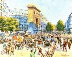 Civilians join German soldiers on their first mile's march towards Paris. |