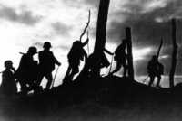 Moving out at dawn - sturmtruppen silhouetted against the morning sky. These troops would be brought up to the front under the cover of night so that they would not be detected by enemy reconnaissance. The surprise must be complete. |