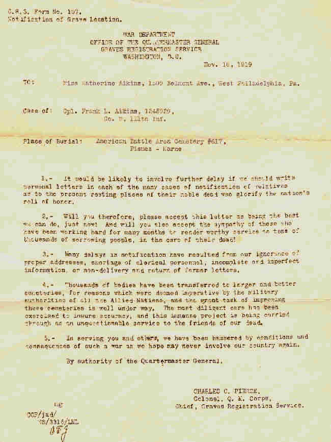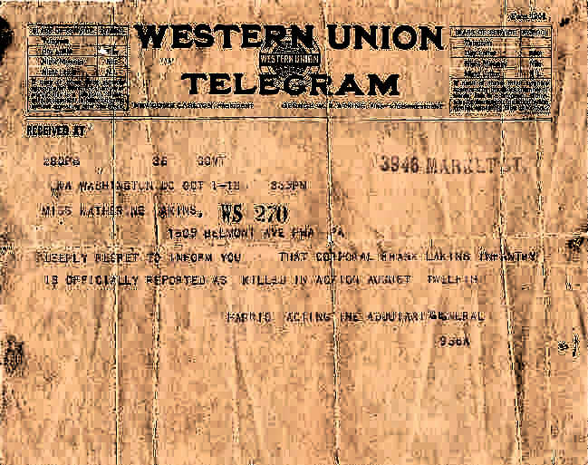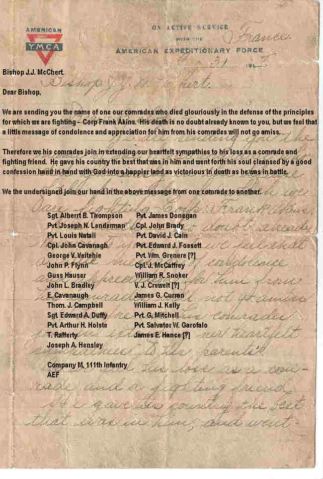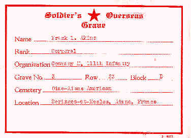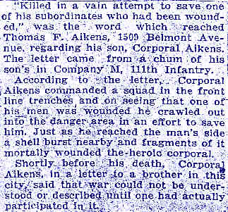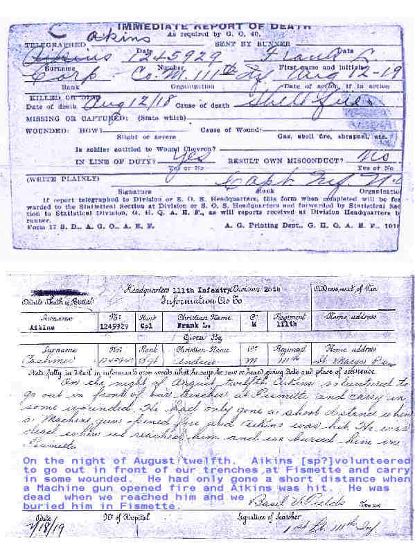 ![]() Corporal Frank L. Akins, 111th Infantry, KIA August 12, 1918