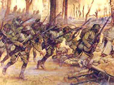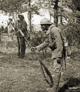 Each of the four segregated infantry regiments of the 93rd Division [369th,370th,371st & 372nd] were parceled out to French Divisions. The soldiers were issued French rations and equipment, most memorably, the distinctive French helmet. They never fought together as a division, although, three of them served very close-by in the Champagne. The other regiment, the 370th Infantry, served north of the Marne. ![]() Black Doughboys in their French KitsHow over 15,000 American soldiers came to be nearly amputated from their own army is difficult to fathom today. It was partly a vestige of the segregated character of American society in those days, and partly due to the desperate need of the French Army for fresh assault troops combined with their positive experience with their Colonial forces. A. The 369th, 371st and 372nd Infantry Regiments in the ChampagneWhen the French Fourth Army advanced northward in the Champagne on September 26th three regiments of the 93rd American Division were included as units in the French divisions of the IX Corps, which was directed to attack from a position a few miles west of the Argonne Forest. The 369th Infantry had entered this general area on April 16, 1918, and was in support when the attack of September 26th started, attached to the 161st French Division. It had held a section of trenches near Butte du Mensil from July 23rd to August 19th. The division eventually advance north to the Souain - Cernay road. The 369th entered a gap in the line during the first day and took the town of Ripont, capturing a number of prisoners and several pieces of artillery. It continued forward during the 27th and 28th, gaining a foothold on Bellevue Signal Ridge. ![]() Advancing in WoodsOn the 28th the 371st and the 372nd Infantry entered the lines as part of the 157th French Division and attacked at once, advancing about one kilometer. The 372nd made an unsuccessful attack against Sechault from the west on the 29th, its units became intermingled and it was withdrawn for reorganization. On the 29th the 369th Infantry captured Sechault, while the 371st took Ardeuil and Montfauxelles. On the 30th, the 369th again made a small advance and was relieved from the line that evening, after having suffered heavy casualties. On the same date the 371st captured Trieres Farm.