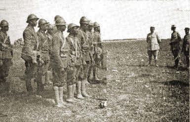 . B. The 370th Infantry Regiment in the Marne SectorThe 370th Infantry, which had served during the summer in both the St. Mihiel and Argonne regions with French units, joined the 59th French Division near Tartiers on September 15th. Four of its companies assisted French troops in unsuccessful attacks against Mont des Singes between September 15th and 22nd, and on the 24th the regiment entered the front line as a unit, just north of Vauxaillon. The 59th Division attacked September 28th, and the 370th Infantry, as one of the assault units, succeeded by October 4th in advancing its lines to the south bank of the Ailette River. ![]() American Troops Inspected by French OfficersThe Germans began a withdrawal from this front on October 12, and the American regiment force a crossing of the Ailette River, advancing into the Bois de Morier. Thereafter, acting as division reserve, it participated in the pursuit as far as Bucy-les-Cerny. The division was then relieved, only to reenter the battle at Grandlup late in October, the American regiment being placed in support near Chantrud Farm, northeast of Laon. There it suffered a loss of 80 men from a single shell on November 3rd. The Germans made a general retirement in early November, and the 59th Division took part in the pursuit. Although spasmodic fighting occurred, the 370th advanced mainly in march formation. At the time of the armistice the forward battalion of the regiment was at Le Gue d'Hossus, having advanced about 40 miles during the last week of the war. |
