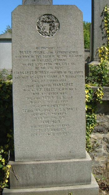 Peter Milne, Jr. 3589931 a soldier of the AEF who was killed at Goblens, Germany on the 23rd April 1919, Age 42. He is buried in a family grave in Aberdeen (Nellfields) cemetery Aberdeenshire UK. The census shows that at 14 years of age he was employed as an office boy in Scotland UK, becoming a trained Lithographer at the age of 23. The exact cause of his death is not available from the military sources due to records being lost or destroyed in a fire that was responsible for many records being lost. As can be seen on the headstone, other family members lived in Rhodesia, the name of the country at that time.