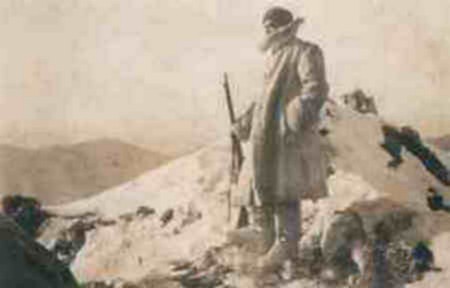 14. An Italian sentry confronts the winter elements atop his mountain post: cold, wind, ice and snow.