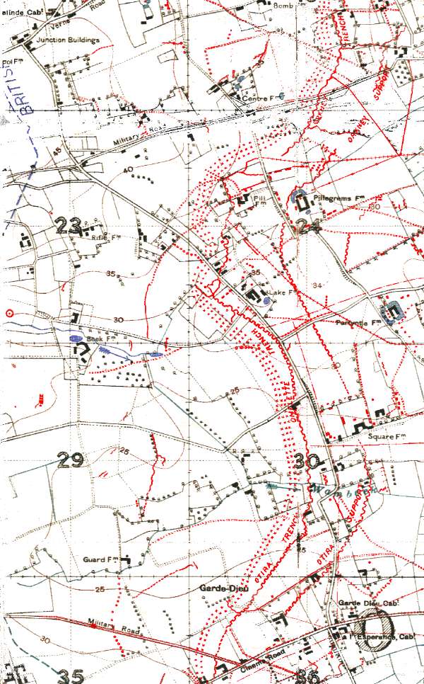 ![]() Above is a before and after sample of computer image restoration. You will notice that the original scanned image (left) has yellowed with age (and it is surely entitled to that) and has incurred serious damage at the fold points towards the center of the image. The image on the right has been digitally "bleached" and the fold damage repaired. This small scale sample took me more than a half hour to accomplish. I have a new respect for those dedicated to the work of restoration. Extrapolating the half hour figure, I would be 107.5 years old by the time I finished this exhibit if I were equally as careful on the all of the trench maps included here. I have restored them reasonably considering time restraints. This means you may notice loss of detail in some spots which were damaged in a similar fashion as the example above. I think you will, for the most part, find the maps quite acceptable. One last note: JPEG compression causes reds to bleed a bit. I think it's a fair tradeoff considering the resulting file sizes. |
