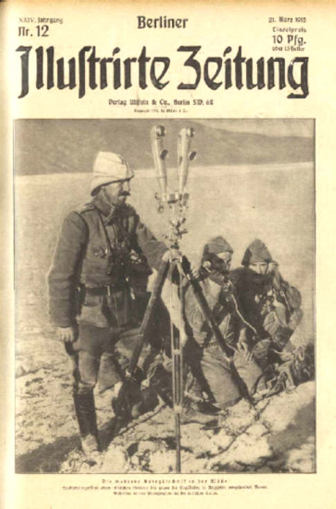The Magazines in this collection are mostly those of the Central Powers, particularly Germany. Leiziger Illustrirte Zeitung (the Leipzig Illustrated Magazine) was undoubtedly the most prestigious and renowned German news magazine of the time. Printed in German in Berlin, Vienna, Budapest and New York editions. It featured lavish color illustrations, often in two-page spreads along with plentiful photographs, drawings, illustrations and artwork as well as text articles by Germany's leading artists and writers. While somewhat stuffy and old-fashioned in appearance, it upheld its foremost place in German journalism throughout the war, suffering little from material shortages, even in 1918 and 1919. This magazine reported almost exclusively on war-news during the war years but like most German magazines tended to shun showing images of fighting and battle. Other periodicals represented here include: Berliner Illustrirte Zeitung, a more 'newspapery' illustrated magazine published in Berlin and aimed at a more middle-class clientele; Die Welt, a small weekly newsmagazine, featuring a number of standard news agency photography and war office official comminqués along with regular news-items of the more anecdotal kind; Der Krieg 1914, one of dozens of magazine especially created to report war-news and publish war-photographs. | |||