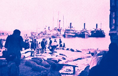 ![]() Turkish Ferries Near the DardanellesAll night we went chunking southward - it is well over a hundred miles from Constantinople to the upper entrance to the straits - and shook ourselves out of our blankets and the cinders into another of those blue-and-gold mornings which belong to this part of the world. You must imagine it behind all this strange fighting at the Dardanelles - sunshine and blue water, a glare which makes the Westerner squint; moons that shine like those in the tropics. One cannot send a photograph of it home any more than I could photograph the view from my hotel window here on Pera Hill of Stamboul and the Golden Horn. You would have the silhouette, but you could not see the sunshine blazing on white mosques and minarets, the white mosques blazing against terra-cotta roofs and dusty green cedars and cypresses, the cypresses lifting dark and pensive shafts against the blue - all that splendid, exquisite radiance which bursts through one's window shutters every morning and makes it seem enough to look and a waste of time to try to think. It is the air the gods and heroes used to breathe; they fought and played, indeed, over these very waters and wind-swept hills. Leander swam the Dardanelles close to where the Irresistible and Bouvet were sunk; the wind that blew in our faces that morning was the same that rippled the drapery of the Winged Victory. As we went chunking southward with our beans and cigarettes, we could see the snows of Olympus - the Mysian Olympus, at any rate, if not the one where Jove, the cloud-compelling, used to live, and white-armed Juno, and Pallas, Blue- Eyed Maid. If only our passports had taken us to Troy we could have looked down the plains of Ilium to the English and French ships, and Australian and French colonials fighting up the hillside across the bay. We got tea from the galley, and -with bread and helva (an insinuating combination of sugar and oil of sesame, which tastes of peanuts and is at once a candy and a sort of substitute for butter or meat) made out a breakfast. A Turkish soldier, the only other occupant of the deck, surveyed these preparations impassively; then, taking off his boots, climbed on a settee and stood there in his big bare feet, with folded hands, facing, as he thought, toward Mecca. The boat was headed southwest, and he looked to starboard, so that he faced, as a matter of fact, nearly due west. He had knelt and touched his forehead twice to the bench, and was going on with the Mussulman prayer when the captain, a rather elegant young man who had served in the navy, murmured something as he passed. The soldier looked round thoughtfully; without embarrassment, surprise, or hurry stepped from the settee, pointed it toward the Asiatic shore, and, stepping up again, resumed his devotions. ![]() German U-Boat & Turkish Patrol Boat at the DardanellesThe Marmora narrowed, we passed Gallipoli on the European side, ... and on into the Dardanelles proper and the zone of war. It was some forty miles down this salt-water river (four miles wide at its widest, and between the forts of Chanak Kale and Kilid Bahr, near its lower end, a fraction over a mile) from the Marmora gateway to the Aegean. On the left were Lapsaki and the green hills of Asia, cultivated to their very tops; on the right Europe and the brown hills of the peninsula, now filled with guns and horses and men. Over there, up that narrow strip of Europe, running down between the Dardanelles and the Aegean, the Allies had been trying for weeks to force their way to Constantinople. They had begun in February, you will recall, when they bombarded the forts at the outer entrance to the Dardanelles - Sedd ul Bahron the European side, at the tip of the peninsula, and Kum Kale, across the bay on the Asiatic shore.. These forts occupy somewhat the relation to Constantinople that Sandy Hook does to New York, although much farther away - they face, that is to say, the open sea, and the guns of the fleet, heavier than those of the old forts, could stand off at a safe distance and demolish them. When the ships pushed on up the strait toward Kilid Bahr and Chanak Kale - somewhat like trying to run the Narrows at New York - there was a different story. They were now within range of shore batteries and there were anchored mines and mines sent down on the tide. On March 18 the Irresistible, Ocean, and Bouvet were sunk, and it began to be apparent that the Dardanelles could not be forced without the help of a powerful land force. So in April landing parties were sent ashore: at Kum Kale and Sedd ul Bahr, at Kaba Tepe and Art Burnu, some twelve or fourteen miles farther north on the Aegean side of the peninsula, and at another point a few miles farther up. At Sedd ul Bahr and along the beach between Kaba Tepe and Art Bumu the Allies made their landing good, dug themselves in, and, reinforced by the fire of the ships, began a trench warfare not unlike that which has dragged on in the west. ![]() French Battleship FNS Bouvet Goes Under the WaveUnder these conditions the fighting had been going on for weeks, the English and French holding their ground at Sedd ul Bahr and Ari Burnu, but getting no nearer Constantinople. And as we went chunking down the strait that night and into Ak-Bash in the dark, two new forces were coming in. The next day a German submarine - come all the way round through the Mediterranean - was to sink the Triumph and the Majestic, while another American correspondent, who had intended to come with us but took the transport Nagara instead, saw the head of an English submarine poke through the Marmora. A blond young man in overalls and white jersey climbed out of the conning-tower. "Will you give us time to get off?" cried the American, the only one on board who could speak English. "Yes," said the young man, "and be damned quick about it." Ten minutes later, from the boats into which they had tumbled, the passengers saw a cloud of yellow smoke, and the Nagara 