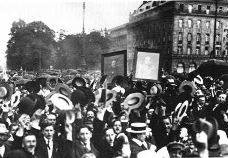 Citizens of Vienna with portraits of the two Kaisers, Wilhelm II and Franz-Josef. |