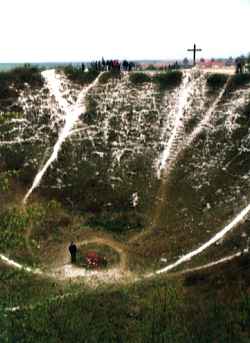 80,000 lbs of explosive under the German trench line was blown at 7.28am on 1-Jul-1916 causing this crater.Many of the battalion survivors fought a final action on the lip of this crater.Phil's son Ben stands at the bottom. |