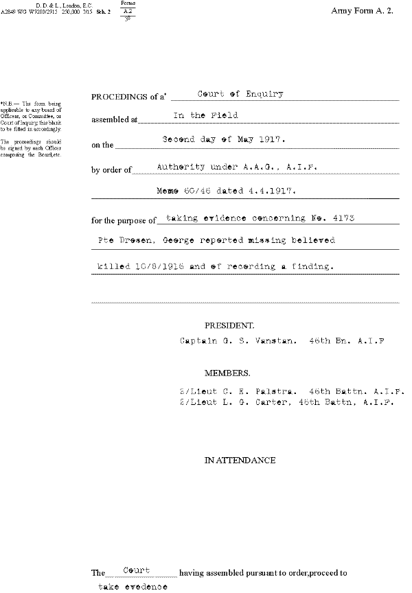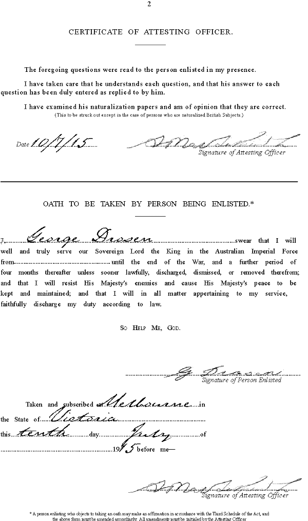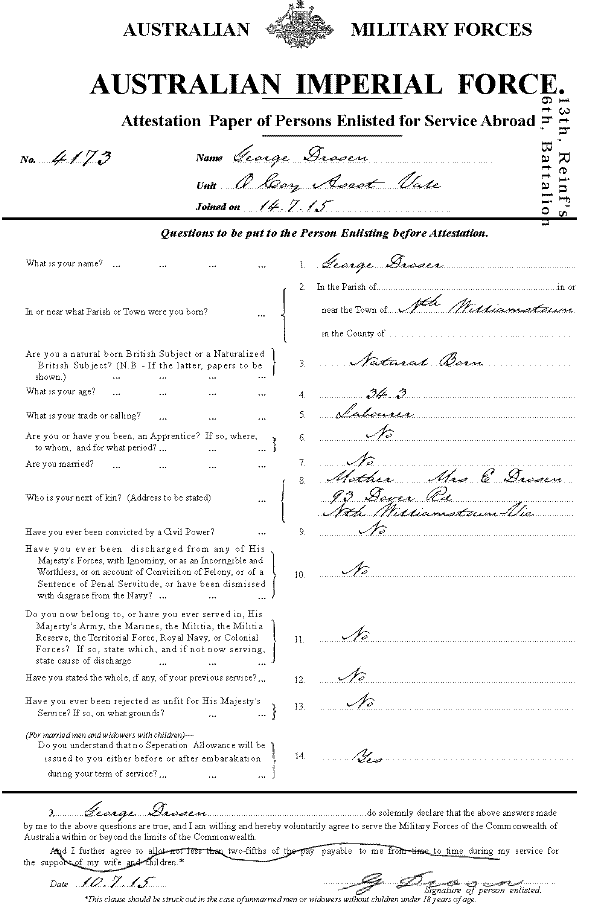 By trade a labourer, George enlisted in the A.I.F along with his younger brother Ernest in July of 1915 as a result of the Victorian Government's great recruiting drives of the period. It is interesting that he gave his name as George Drosen not listing his second name of Adolphe due most likely to the anti-German feeling of the time.