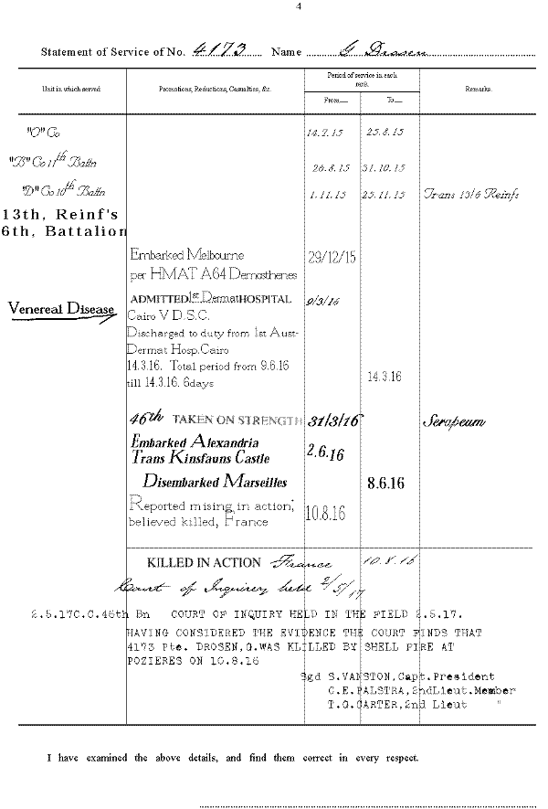 Initially assigned to the 13th reinforcements of the 6th Battalion, Drosen embarked from Melbourne Victoria per His Majesty's Australian Transport A64 on the 29th of December 1915. After disembarking in Egypt he was transferred to the 46th Battalion at Serapeum Egypt, as a result of illness and the general reorganization of the AIF after the Gallipoli campaign.