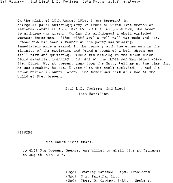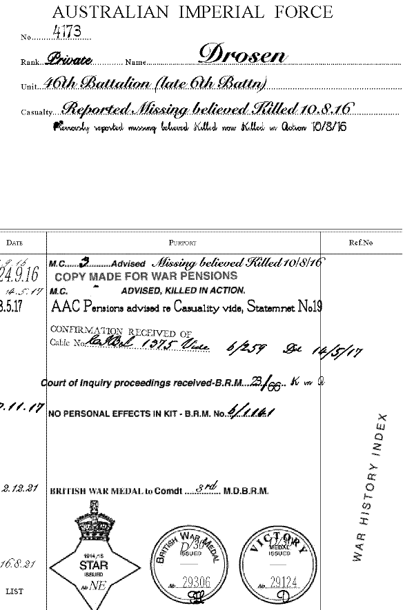 Thrown into the Battle of the Somme, George Drosen's military career was short lived. On the 10th of August 1916 he was killed in action while on night patrol at Pozieres, France. He was survived by three brothers and a sister back in Australia.
