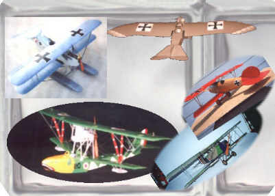 Ray's Flying Circus Representative Models: Clockwise from Top Left Brandenburg W1Z, Rumpler Taube 4c, Richthofen's Early Aeroplane: Albatros DVa, Breguet 14B, Macchi M5 Seaplane Fighter |
