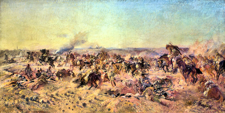 The Australian Light Horse was to be used purely as cavalry for the first time. Although riders were not equipped with cavalry sabers, the Turks who faced the long bayonets held by the Australians did not consider there was much difference between a charge by cavalry and a charge by mounted infantry. The Light Horse moved off at the trot and almost at once quickened to a gallop. As they came over the top of the ridge and looked down the long, gentle open slope to Beersheba, they were seen by the Turkish gunners, who opened fire with shrapnel. But the pace was too fast for the gunners. After three kilometers, Turkish machine guns opened fire from the flank, but they were detected and silenced by British artillery. The rifle fire from the Turkish trenches was wild and high as the Light Horse approached. The front trench and the main trench were jumped and some men dismounted and then attacked the Turks with rifle and bayonet from the rear. Some galloped ahead to seize the rear trenches, while other squadrons galloped straight into Beersheba. This epic charge broke the back of the Ottoman defense. The Anzac mounted troops were soon swarming through the streets of Beersheba, which was secured within an hour.