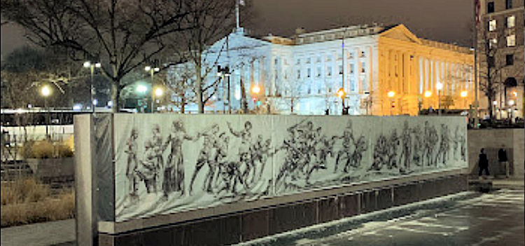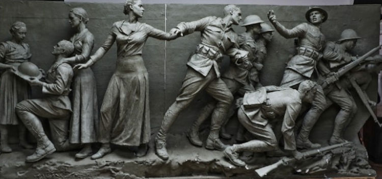 As you can see from the photo above, even though the National World War I Memorial is fully open, its centerpiece, Sabin Howard's epic bronze sculpture, A Soldier's Journey, is not in place yet. The temporary substitute is a matching cartoon of the completed work. The final version will be installed in four sections from left to right. Hopes are to complete the installation by late 2023 or early 2024. The complicated multi-step design process starts with armatures of each of the 38 figures created using 3-D printing by a firm in England. When they are returned to the U.S., Sabin sculpts the finished figures in clay. The clay figures are then cast in bronze back in England at a foundry. For the first section (shown in clay below) the process is nearing completion. As soon as the foundry completes its work, section one will be shipped back to Washington and installed at the site. When that is to take place, we will, of course, announce the event for all our readers.