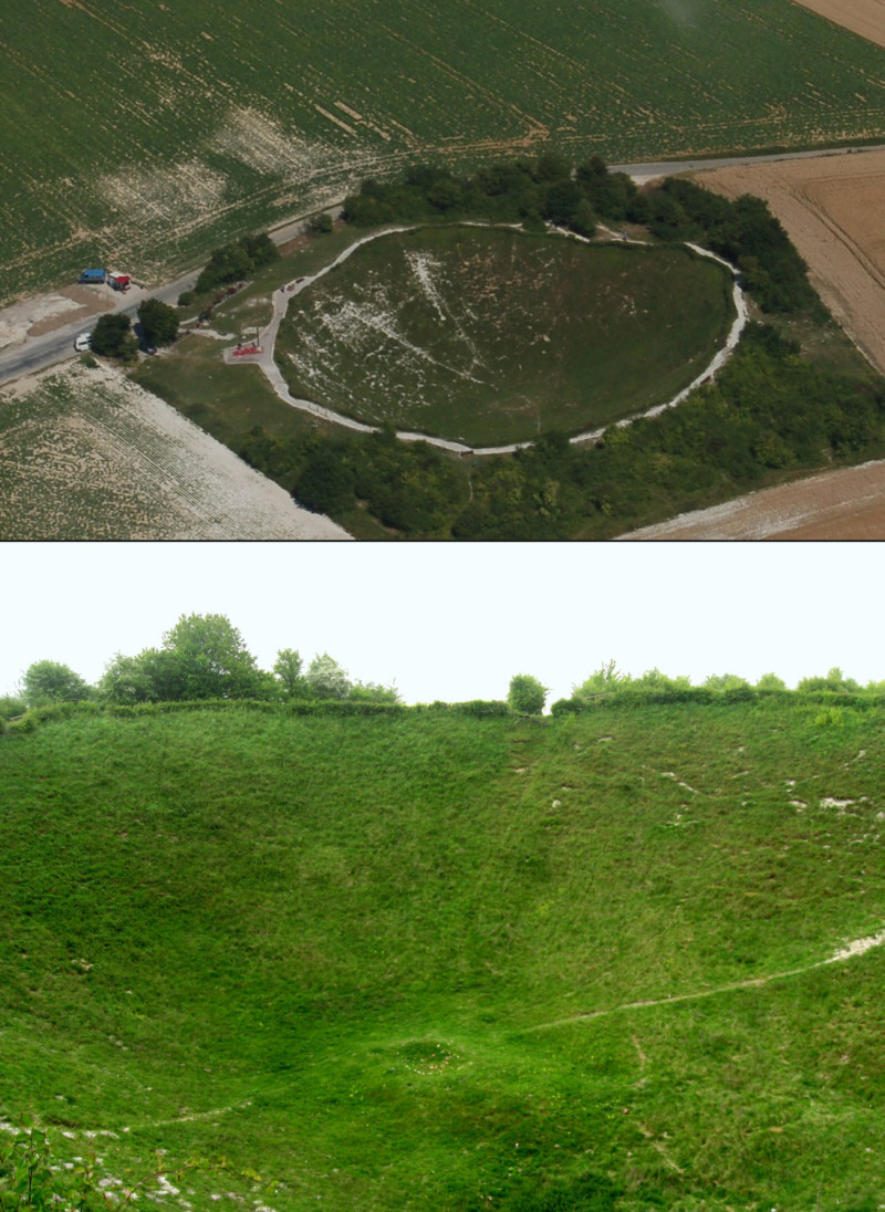 When walking the battlefields of the Somme it is evident that most of the visible signs of destruction caused by the First World War have disappeared. The enormous Lochnagar Crater is one of the few surviving scars left on the terrain in this region. A monument to the devastation of war, this crater was caused by a 60,000-lb mine and is 100 metres in diameter and 30 metres deep. It is hard to capture its sheer size in a photograph (note the parked vehicles in the upper image).