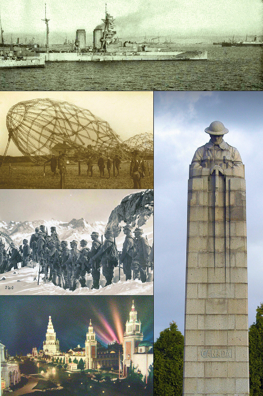 From the Top: HMS Queen Elizabeth prepares for the doomed naval assault on the Dardanelles; a zeppelin downed over Essex; the "Brooding Canadian Soldier" commemorates the first gas attack on the Western Front north of Ypres; Austrian mountain troops in the Italian Alps; a World's Fair in San Francisco in the midst of a world war