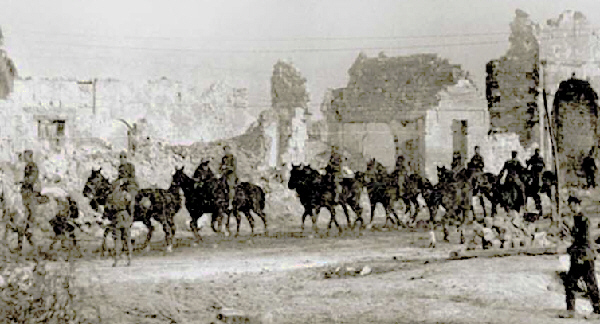 Flank patrols were sent out on both flanks, keeping abreast of the head of the column. The patrol on the right, due to the open country, kept well over from the road, that on the left kept at the foot of the ridge with scouts on the ridge. Realizing that much valuable information could be obtained by even a small unit as a troop and anxious to redeem our first brush with the enemy, the troop moved out at a brisk trot in the regular formation of point, advance party, and main body, in columns of troopers on either side of the road. The advance led through town already ablaze, left burning by the German retreat. To go through the towns keeping on the main road was a reckless proceeding, as a few machine guns well posted could do us great damage but to circle around would lose time and Captain Harmon, desiring to get back information quickly, took the chance and kept up a fast trot going north on the main road. The men were instructed that if in passing through the towns, machine gun fire was encountered, to leave the road from the right and left and get between the houses under cover. The first town passed through was Hattonville, about two kilometers north of Vigneulles. This town was deserted but was all afire, the flames scorching us as we passed through.