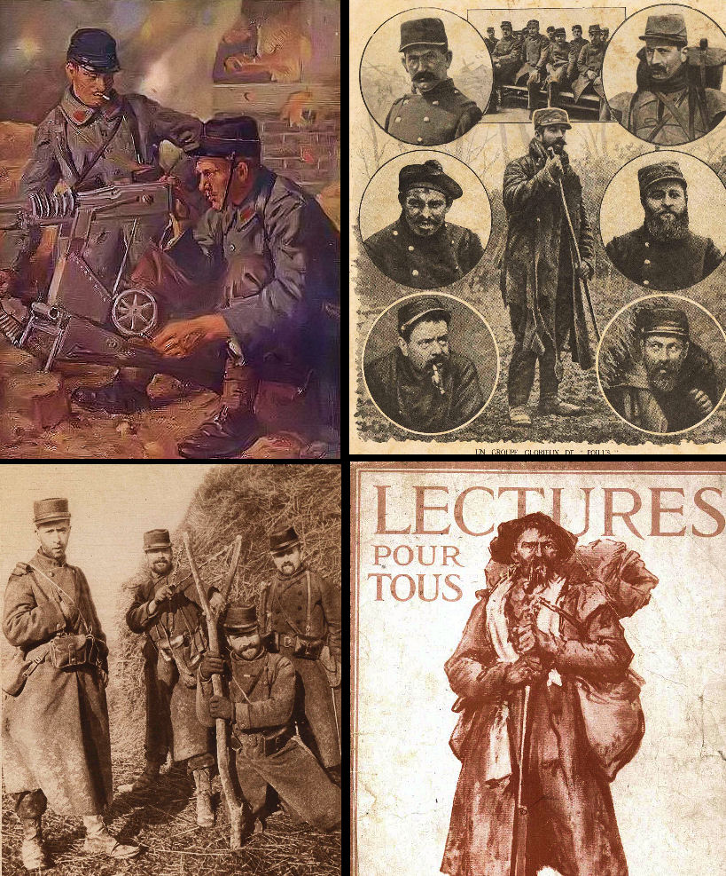 The French frontline soldier of 1914 began morphing into the "Poilu" or "hairy one" as the war turned into a long slog. The expression has origins in the Napoleonic Wars and while it explicitly refers to the facial hair that the men in the trenches affected, it suggested some other qualities like virility, self-reliance, the rural background of many of the soldiers, and a propensity to resist authority (grumbling).