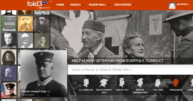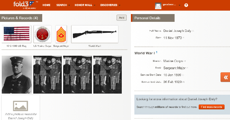 Fold3, the military records subsidiary of Ancestry.com has added a valuable service for honoring American veterans of all conflicts. While full access to all military records on Fold3 requires a paid subscription, they have made a great opportunity for of America's families at no charge. They have created the ability for you to post the name, photos, service information, and documents of your veteran online in a massive website. This is one way that you can insure that their service will never be forgotten. Here we will show what you can do, using the records of Marine double Medal of Honor Recipient Dan Daly's service as an example. Here is the World War I section of the Honor Wall itself. The snapshots on the left is a carousel of all the veterans that is revolving when you visit the page. http://www.fold3.com/wall/ Note that you can also search the Honor Wall to see who is listed.