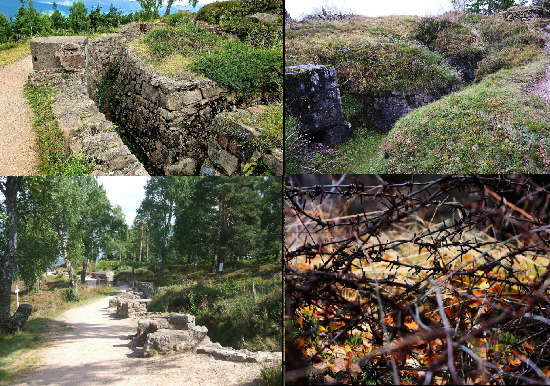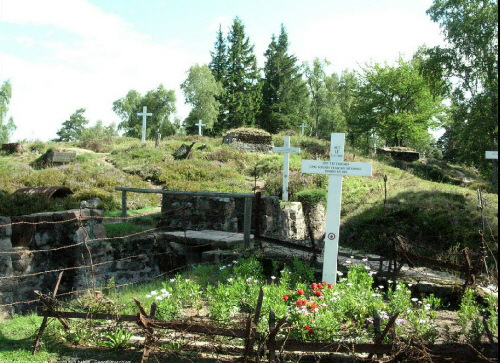 The area shown here between the 1914 border and the line of 1915–1918 was the only German territory occupied by the French Army before the Armistice. The battlefield is situated at the top of a rocky hillock, dotted with a few trees and lined with trenches dug out of the sandstone. The bunkers and barbed wire which crisscrossed the area have been retained. A very moving memorial site, the battlefield contains numerous black-and-white crosses marking the final resting place of French and German troops. A museum includes numerous items found on the site: weapons, personal belongings, munitions, and other relics. Models of the battlefield, video clips, and photos further add to the experience.