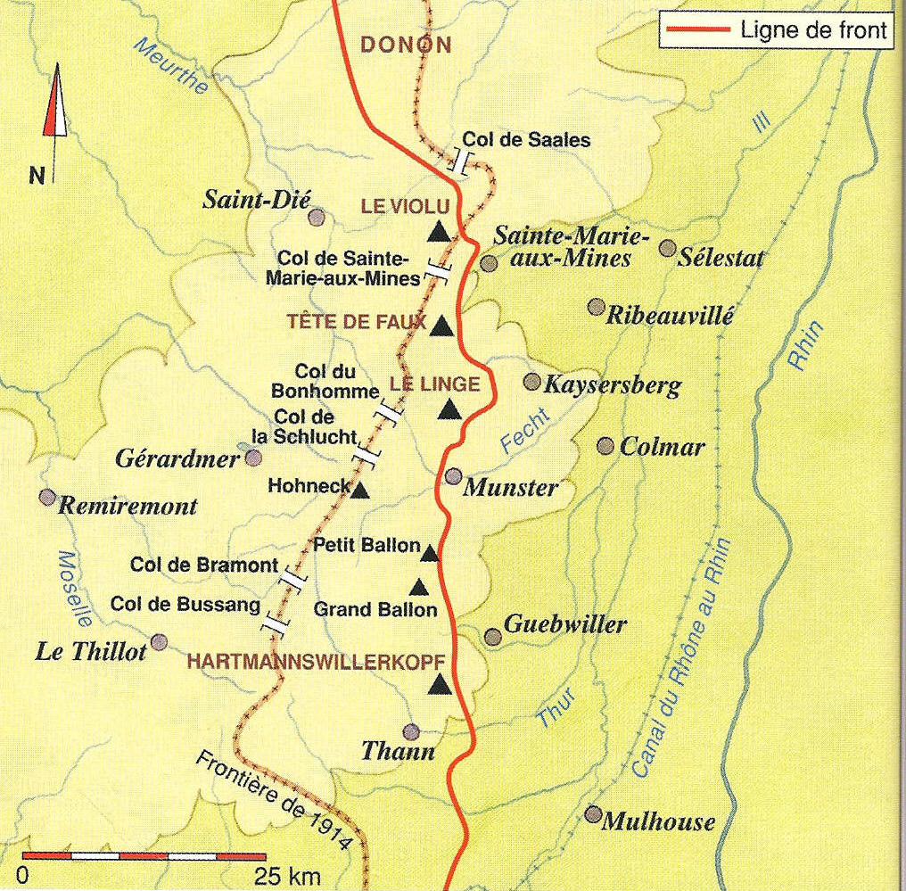 The struggle for Le Linge, a 1000-meter tall hilltop located 14 miles west of Colmar in the Vosges Mountains, was one of the bloodiest battlefields of the Great War, but is mostly forgotten today. The hill was the site of some of the closest, most intense trench fighting in history. The Germans organized their defense here in 1914 in order to prevent French troops advancing on Colmar. In 1915 this area was part of the Alsace, which Germany considered its own. Despite having a much more secure position on a higher ridge west of Le Linge, Joffre insisted his troops keep attacking. The peak fighting, between 20 July and 15 October 1915, was extremely violent, with 17,000 killed counting both the French and German losses. Gas and flamethrowers were used here. Subsequently, both sides came to realize that a major breakthrough in the Vosges was unfeasible and major operations in the region ceased for the duration.