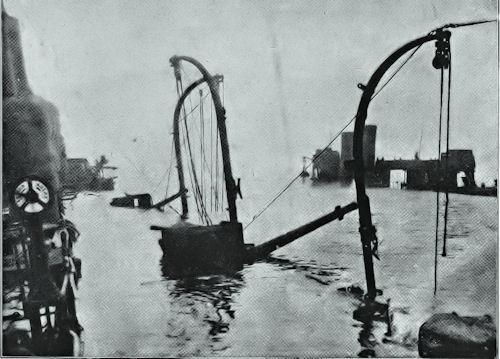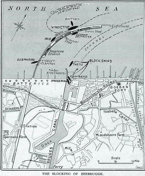 Zeebrugge on the Belgian coastline was an outlet for German U-boats and destroyers based up the canal at Bruges, and the British planned to sink three old cruisers Iphegenia, Intrepid, and Thetis, in the channel to block it. These would have to pass a long harbor mole (a causeway or pier), with a battery at the end, before they were scuttled. It was decided therefore to storm the mole using another old cruiser, HMS Vindictive, and two Mersey ferries, Daffodil and Iris II, modified as assault vessels. Two old submarines were to be used as explosive charges, under the viaduct connecting the mole to the shore.
