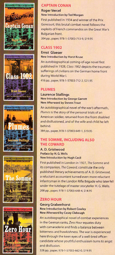 He has now combed the archives of the Bruccoli collection and has persuaded his university press in South Carolina to release ten of these forgotten literary gems in a series. Naturally, he has dedicated it to his father, Joseph Bruccoli. The first five releases are now available and are displayed on the right. They are printed in quality paperback format and are beautifully designed as a set. The second group of five titles are planned for release in late 2008 or early 2009. The second batch will include the story of the British retreat in March 1918, an account of Australian service on the Western Front, and an all-verse account of battlefield experience in the American Army edited by Trip-Wire reader Bradley Omanson titled This Man's Army: A War