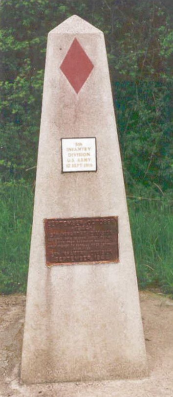 Notice that the marker above for the U.S. Fifth Division, located at Regnieville on the south edge of the St. Mihiel Salient, bears two plaques. The 5th division launched major offensives from the same spot in both World Wars. On 12 September 1918 it attacked here in the four-day reduction of the St. Mihiel Salient and on 16 September 1944 the division joined the two-month operation to capture the fortress city of Metz.