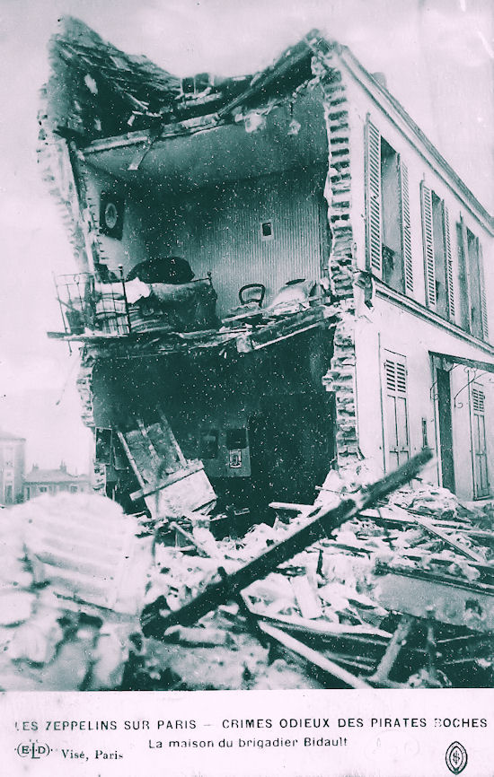 Image Above: Zeppelin damage to the home of Brigadier Bidault. The caption translates: "Zeppelins over Paris—Odious Crimes of the Boche Pirates."