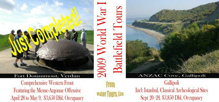 TRENCH REPORT: I think I promised our readers some photographs from the recent battlefield tour I led to the Western Front. We will have to roll that over until next month, we are still gathering photos from our participants, and I am off shortly to help lead a tour group to Normandy for the 65th anniversary of the invasion -- a busy summer for your editor. Some fall events are looming, however, and I hope you will keep them in mind when you read the announcements below, particularly the combined WFA-USA and Great War Society at the National World War I Museum, and my own tour to the Gallipoli battlefields. MH