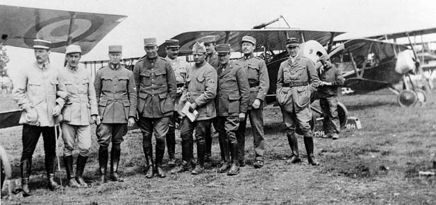 Founding Escadrille member Bill Thaw on the left alongside legendary French ace Charles Nungesser. Nungesser was attached to the squadron for a short time while recuperating from injuries he received in a crash. Capitaine Georges Thenault (far right) was the commander