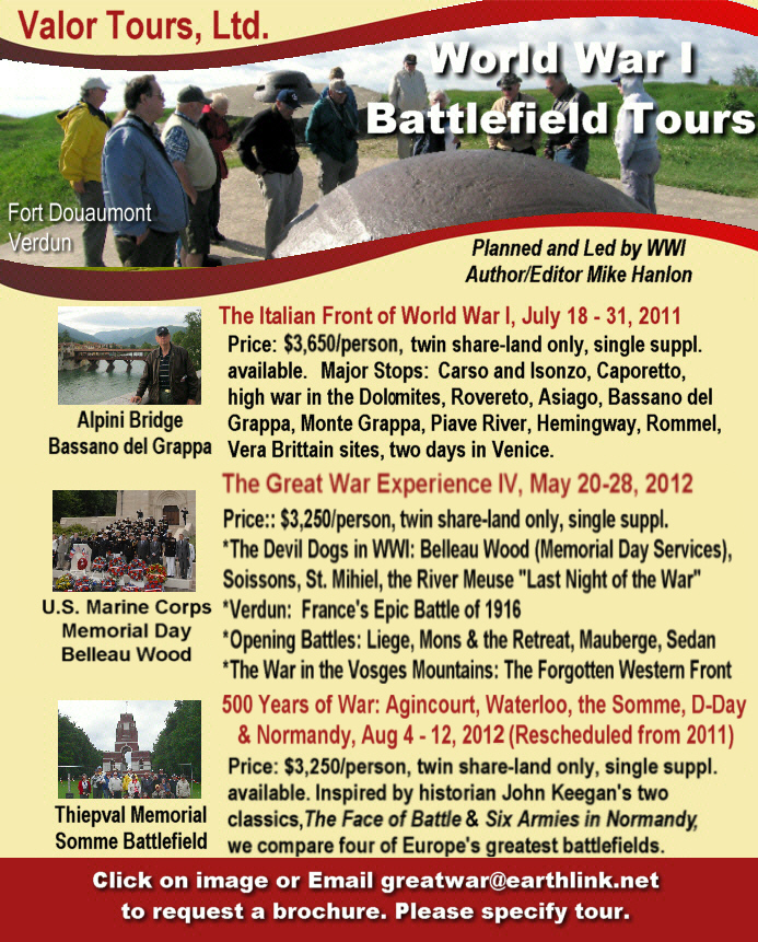TRENCH REPORT: As you can see from our masthead, this issue of the Trip-Wire will cover two months. Much of my time in July will be taken up preparing for my group tour of the Italian Front or the trip itself. I hope you will enjoy this issue, it includes a good helping of our usual variety of World War I topics. The next issue should include some new material and images on the Great War in Italy. All the best until September.MH