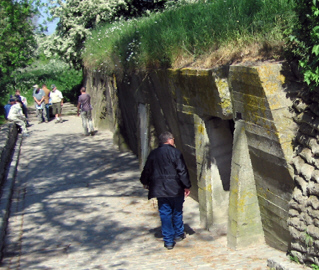 La Mare aux Boeufs -- roughly speaking, the name means 'the Bull Wallow' -- is a tiny place, the sort that a visitor would drive through without really noticing, which probably explains why the first aid post has escaped undisturbed. It is very easy to miss. Having arrived in the 'centre' of La Mare aux Boeufs -- a mere handful of houses at the junction of two roads -- the determined and previously informed visitor has to leave his car and follow a grassy track along a stream for a few hundred yards in the hope of spotting something tucked cleverly under the hillside that looks like a long bunker. The old aid post is heavily overgrown and when you have found it, you have to climb over a fence to get in. Once there, you see the inscription that so many wounded men must have hoped would apply to them -- Glück Auf ("To Luck").