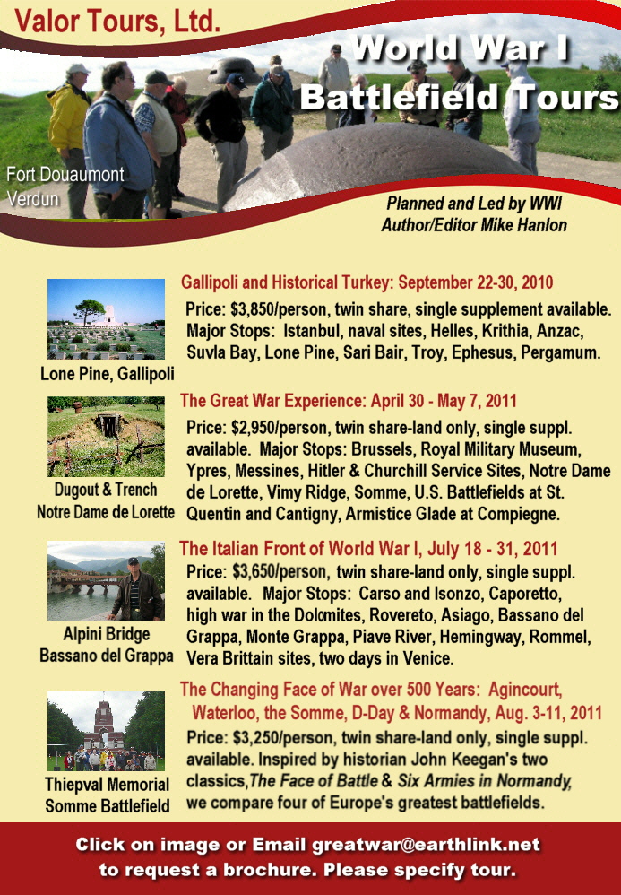 TRENCH REPORT: Much has transpired since our last issue. Your editor led his annual tour of the Western Front and completed an 1800-km reconnaissance of the Italian Front (photos below). . . Also down below you will see updated information on future tours I will be leading, including the July 2011 expedition to the Italian Front. . .Upon returning I received the sad news of the death of my friend and contributor to our Website Margaret Haas, 81, in Snyder, New York. Right up until her passing, we were helping Margaret in her project to find a publisher for the diary of her father, Albert, who served with the Intelligence Section of the 309th Infantry, 78th Division of the AEF. Alas, she did not succeed. I felt her manuscript was one of the best of the several hundred such documents I've examined over the years. We have an excerpt online. (link). . .Last month we had a major feature on those readers who have recently published books on the war. In the future I would like to do the same for those of you who maintain Great War Websites and blogs. Please send an email with the title, url and a summary of your theme and content. (email) MH