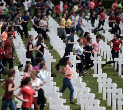 In any case, it's not just the Somme that gives 1916 its big historical footprint. Last month, for instance, Germany and France once again met on the Verdun battlefield, apparently to make a political statement. With Chancellor Merkel and President Hollande watching approvingly, the hallowed ground of the French National Cemetery, overlooked by the mournful Ossuary, was used for a mock battle conducted by 3,400 young people. They divided into two groups and lined up facing one another from either end of the huge burial site. At a signal, these opposing battalions, lacking any vulgar and passé nationalistic regalia, but exquisitely balanced by sex and ethnicity, charged each other over the graves, through the cemetery's 15,000 crosses, Stars of David, and Muslim steles, and then symbolically massacred each other. Thousands of mock corpses were soon strewn across the graves holding the fallen of the real Battle of Verdun.