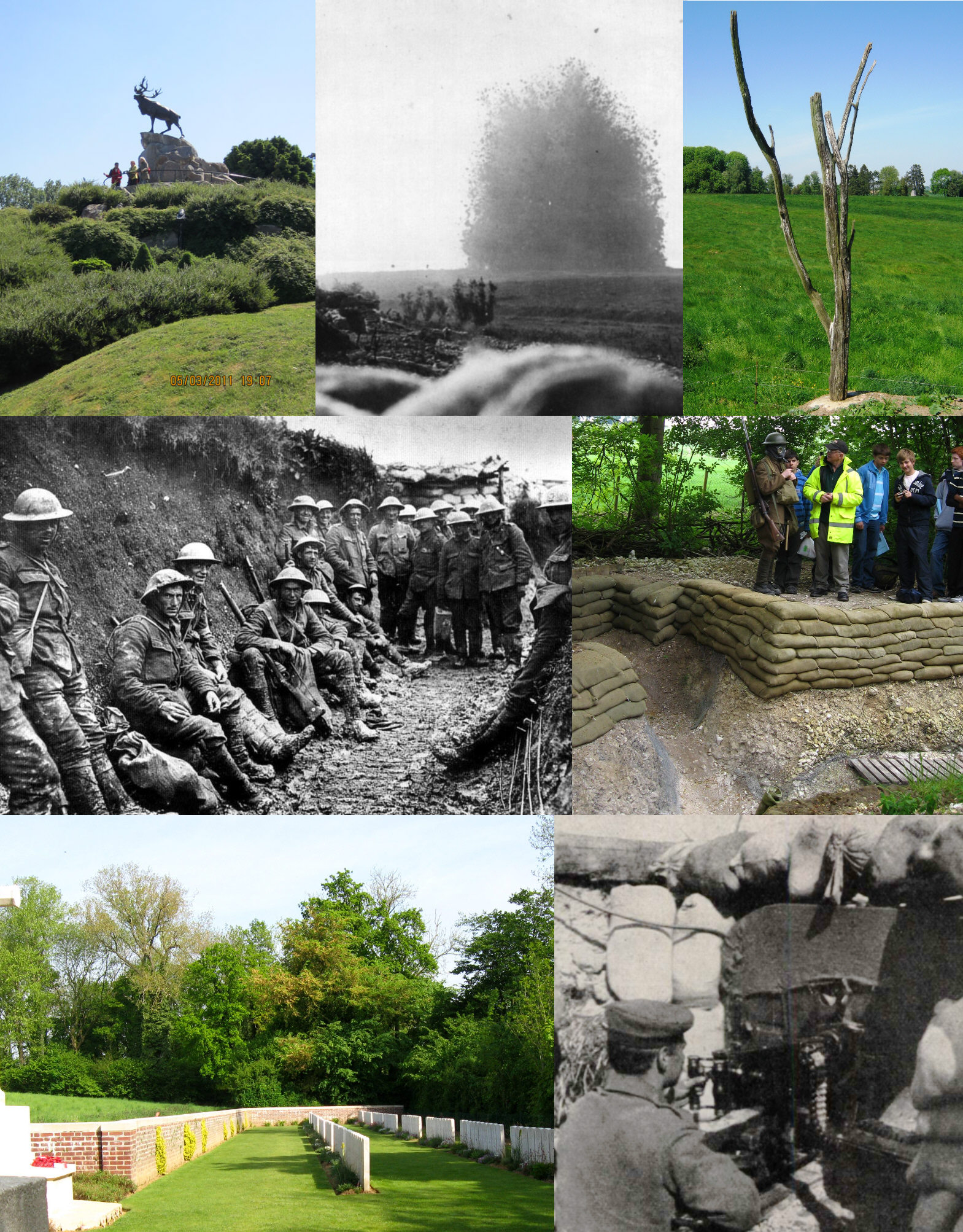 Top Row: Three scenes from around Newfoundland Memorial Park. The caribou statue surveying the trenches symbolizes the Newfoundland Regiment that went over the top here in the third wave on 1 July and suffered almost 90 percent casualties in minutes. Earlier and close by was the explosion of Hawthorne Mine under German lines that the Lancashire Fusiliers were unable to exploit. Blown before the signal to attack, it warned German troops in deep bunkers that the assault was imminent. A replica of the "Danger Tree" stands in the old battlefield's No-Man's-Land. It was part of a group of trees that provided the only apparent cover in the area. Soldiers crawled toward them, but they were still easy targets.
