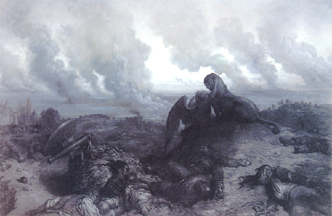 Tony Langley is traveling this month, so I'm presenting something on his behalf that some of our San Francisco chapter members recently discovered at a visiting exhibit from the Musée d'Orsay, Birth of Impressionism at the De Young Museum. It's the sort of thing Tony finds irresistible. French illustrator Gustave Doré, stirred by the disastrous defeat in the 1870-71 war with Prussia, created a battlefield scene more from the 20th century than his own. The "enigma" seems to involve the centerpiece of the painting, a gargoyle and a sphinx embracing -- an enigma, indeed.