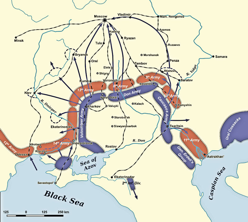 Denikin, on the other hand, continued to advance into Ukraine and southern Russia, entering the Reds’ weakened center on Moscow, and taking in succession Poltava, Odessa, Kiev, Kursk, and Voronezh. By mid-October Denikin’s troops had reached Oryol, roughly 240 miles south of Moscow, essentially the closest he