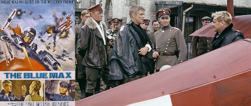 The only shortcomings (for me) involved some characterizations of the principals with respect to the novel. The ruthlessness of former corporal Stachel and the matching seething disdain radiating from his aristocratic rivals are watered down unnecessarily. I was also annoyed that Bruno's mentor was stripped of the pornography collection that made him interesting and added a little humor to the original story. Finally, there's a contrast that I found distracting due to the mixed nationalities (British, U.S., German) of the cast. The Yanks and Brits playing Germans (including the great James Mason) just don't project as Germanic as their compatriots. Consequently, the German Air Service seems more broadly multicultural than the collection of Prussians, Bavarians, and Saxons it was. Nevertheless, this is just the usual stuff from Movieland and shouldn't deter any aviation, history, or high adventure buffs from watching The Blue Max. The film is available on Netflix and for purchase on Amazon.