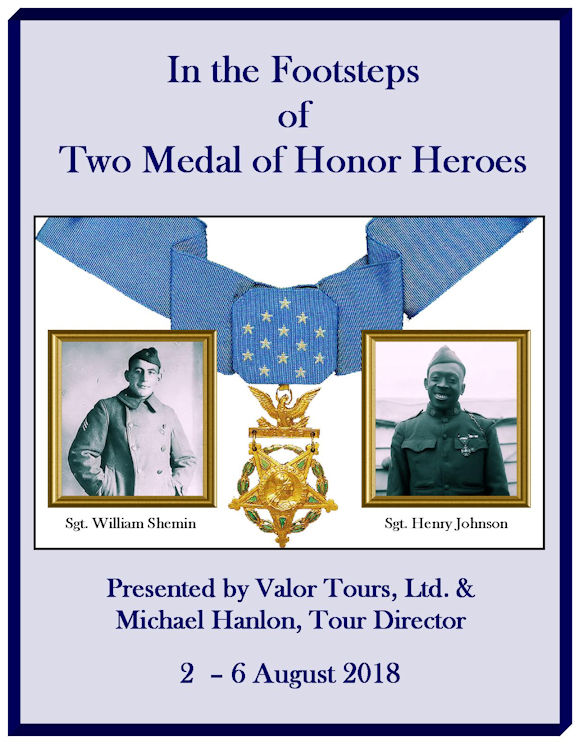 Two years later, I was contacted by Elsie Shemin, daughter of Sgt. Shemin, and was told I had been recommended to her as someone who could organize a tour to the sites where both the recipients had served in France and had fought their most memorable actions. The tour participants would be members of the Shemin family and a representative of the Henry Johnson family, who turned out to be a soldier from the successor unit of the 369th, which is now part of the 42nd Rainbow Division. The trip (cover of the trip book on left) turned out to be one of the most enjoyable I've ever conducted. One thing I learned from this experience–thanks to Elsie's collection of files–was that the services conduct a tremendous amount of research to ensure that the award of the Medal of Honor is fully justified and that there's much more to the story than the terse citations that are usually used in articles to describe the individual's achievements. So, for this issue, I've searched for material that gives some broader information about a representative selection of Medal of Honor recipients, their lives, and their memorable achievements. I hope you enjoy what I've put together. MH