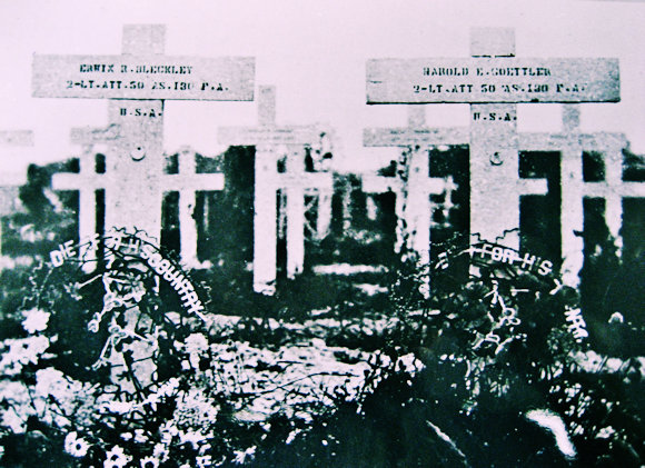 Inevitably, luck ran out when a German machine gun bullet hit and instantly killed Goettler. Moments later, the big Liberty DH-4 dove into a field just inside French lines and crashed, fatally injuring Bleckley as well.