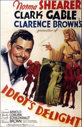 As produced on Broadway in 1936, Idiot's Delight told of the start of a second world war caused by an Italian invasion of France. The setting is an Italian small hotel near the Swiss border. With a surprise air attack on Paris the border is closed. There's the usual assortment of desperate people trying to get into Switzerland: an English couple on their honeymoon, a French pacifist, a German scientist, an American munitions manufacturer and his "Russian" mistress, and an American entertainer traveling with his six chorus girls. All their lives are changed by the war, except for the munitions manufacturer, who betrays his mistress because she knows too much about his business. The Englishman decides to return home to enlist. The French pacifist faces a firing squad. The German scientist drops his cancer research and returns to Germany. The apolitical American entertainer arranges for his chorus girls to leave and recognizes the "Russian" mistress as a stranded American performer with whom he once had an affair in Omaha. They stay at the hotel after everyone has left and are finally killed by a stray bomb. The play was blatantly anti-Italian and obviously anti-war.