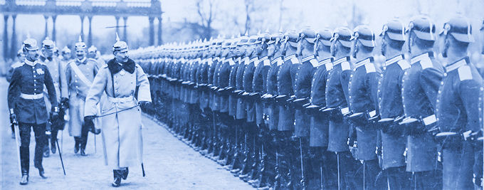 In this prewar photo that perfectly captures the Kaiser's militaristic enthusiasms, he is inspecting a Guards detachment, probably at Potsdam. As Wilhelm marches past, each of the soldier's heads snaps forward from the "eyes-right" position. Like their British equivalents, the "Old Contemptibles," most of these men were probably killed or wounded in the coming war.