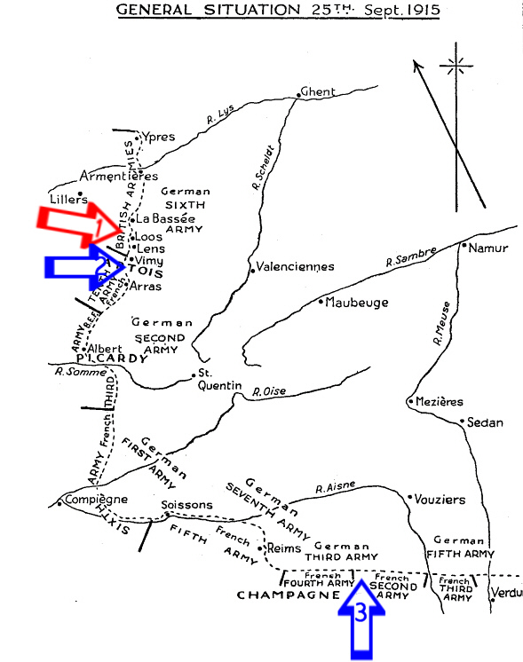 It was in the fall 100 years ago that the Allies learned, undeniably, that there would be no quick or low casualty formula for breaking through the trench system on the Western Front. In late September they launched a double offensive on both faces of the main German salient into northern France. North of Paris a joint British-French assault was launched in Artois, which here will be labeled the Battle of Artois (French segment near Vimy Ridge) - Loos (British portion north of the French sector). In the Champagne at the same time two French Armies launched an attack (2nd Battle of the Champagne). In all cases, there were limited advances, that proved bloody and costly. Below on our Centennial page we provide a strategic overview of this campaign, but here are some sites that provide more details on the fighting.