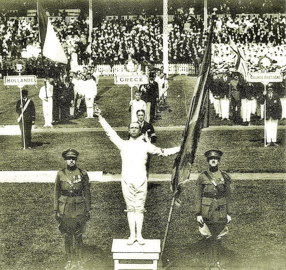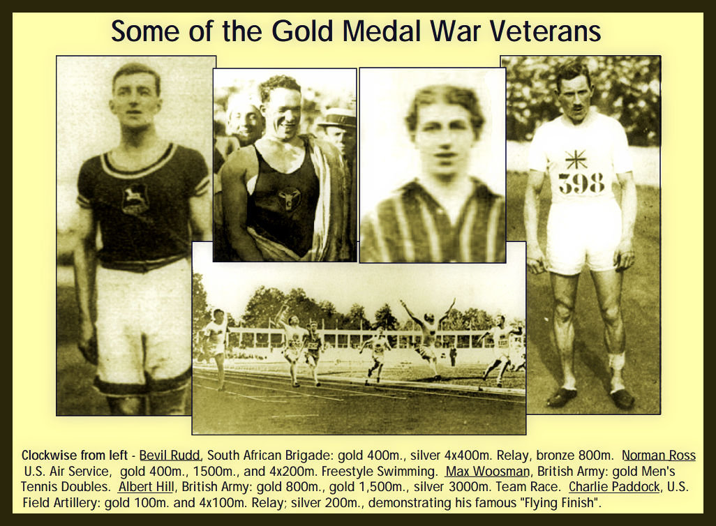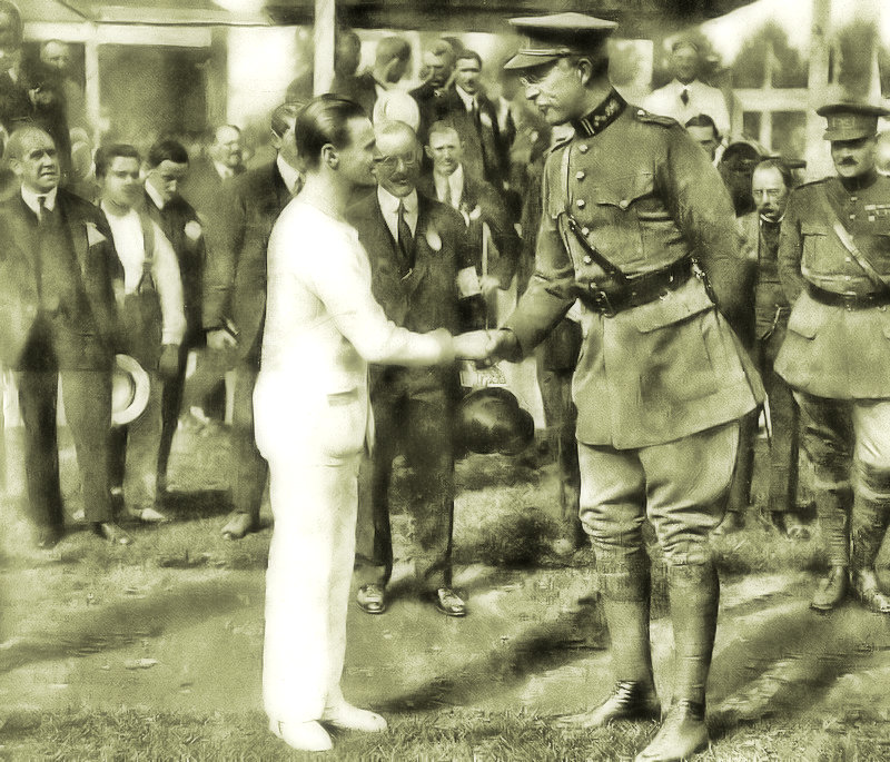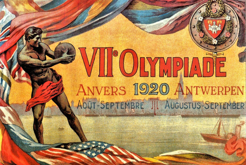 Consider this: Conspicuously placed outside the Olympic Stadium was a statue of a "competitor" executing a difficult athletic throw. The figure (shown here), however, is not an athlete, but a Belgian soldier. And, he is not launching a discus or a javelin, but a hand grenade. Many of the competitors and medal winners at Antwerp had seen combat during the war. A transitional event held the previous year prepared many of these warriors for their move from the battlefield to the arena. After the Armistice, the victorious Allied armies had millions of troops with nothing to do. In the spirit of keeping the men busy and out of trouble and to help them start the transition to civilian life, sports programs sprung up in all the military camps. By January 1919, arrangements were made for a competition in Paris modeled on the Olympics, hosted by American commander General John J. Pershing. Eighteen nations competed in these Inter-Allied Games. Sprinter Charlie Paddock and swimmer Norman Ross would be gold medalists at both Paris and Antwerp. Inter-Allied light heavyweight boxing champion Gene Tunney would later defeat Jack Dempsey for the world heavyweight championship. By one estimate, almost 10% of the competitors at Antwerp were veterans of these games. A year later, the athletes and the world were ready for the return of the Olympic spirit, but the war was not yet forgotten. MH