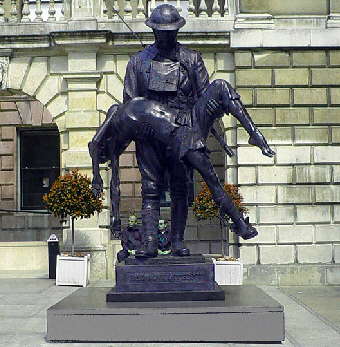 This monumental bronze statue of an American soldier carrying his dead comrade is the work of British artist James Butler, RA. It will be erected on the site of a battle that took place on 26 July 1918, in the vicinity of Fère-en-Tardenois, during the Aisne-Marne offensive. There, one regiment of the 42nd "Rainbow" Division, the 167th (Alabama) Infantry Regiment, overran German positions in and around the fortified Croix Rouge farm, pushing them to the other side of the Ourcq river, and contributing immeasurably to the liberation of the Marne salient.